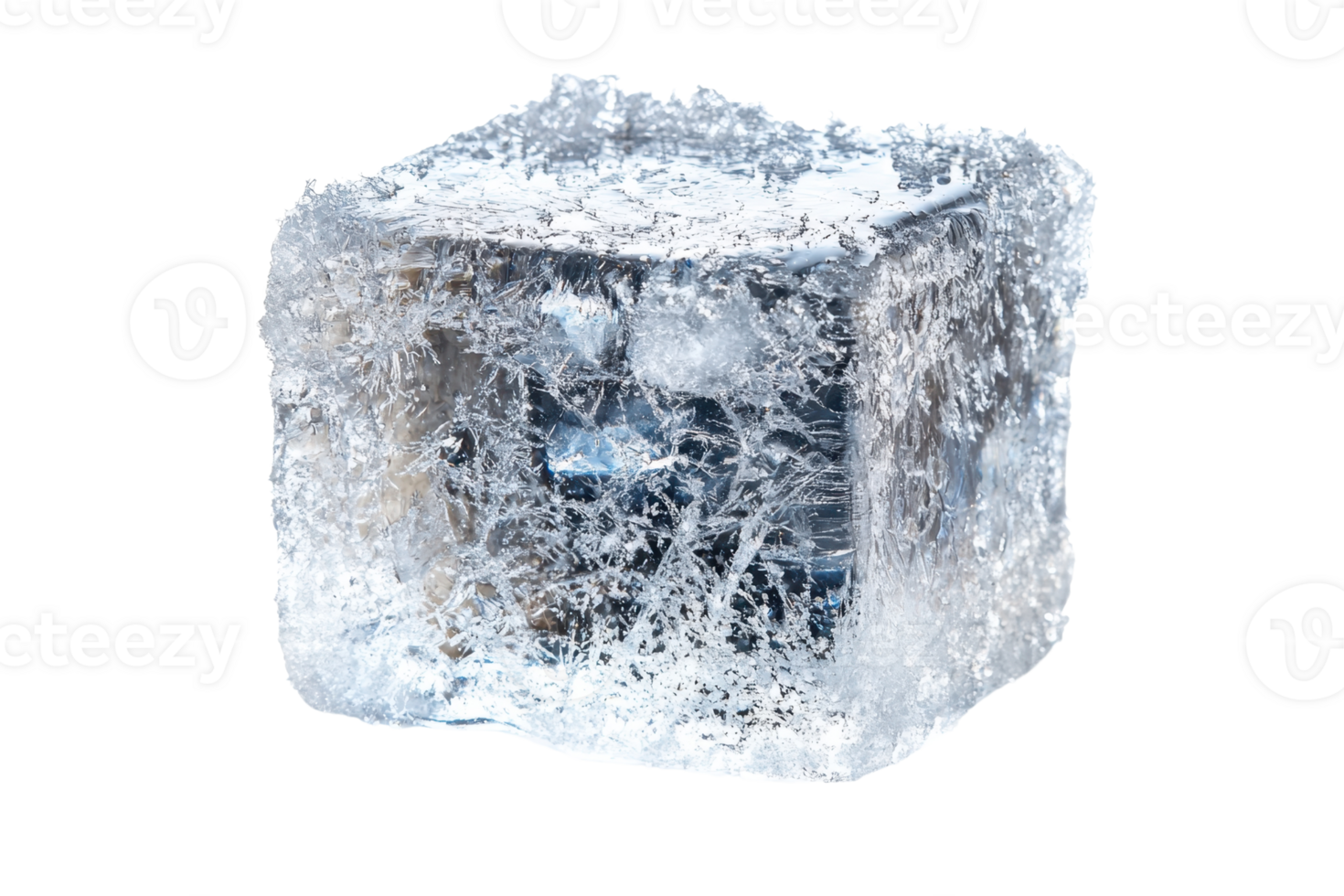 une clair la glace cube avec complexe motifs et textures, encapsulant une foncé objet dans. PNG Pro