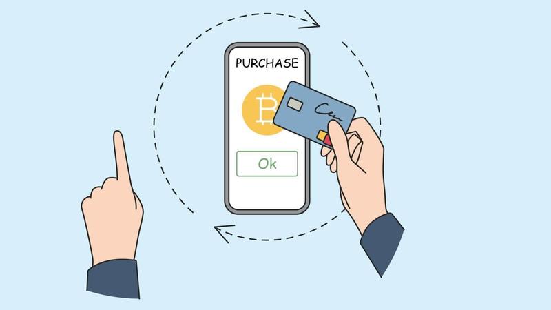 commerçant achetant du bitcoin en payant par carte de crédit sur téléphone portable. l'homme fait une transaction avec la crypto-monnaie sur le gadget. mouvement, illustration. Vidéo Gratuite