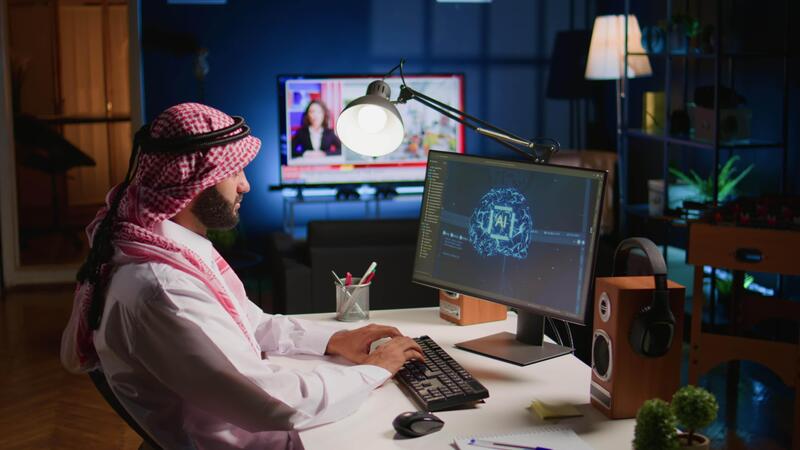 qualifié arabe technicien mise à jour neural les réseaux, l'écriture complexe binaire code scripts sur ordinateur. milieu est homme les usages numérique dispositif programmation à améliorer ai avec la télé comme Contexte bruit Vidéo Pro