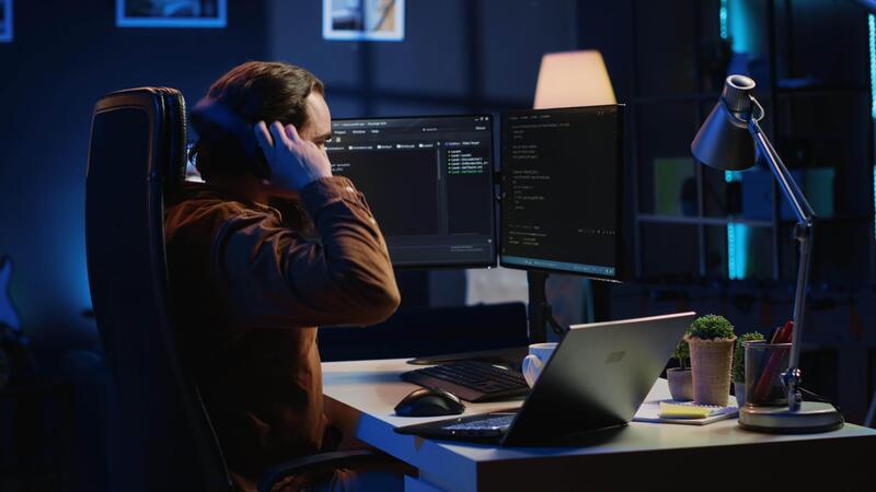 technicien concentré sur dactylographie complexe code dans néon allumé Accueil bureau, développement Logiciel application. il spécialiste enlever écouteurs à mieux concentrer sur difficile tâche, caméra une Vidéo Pro
