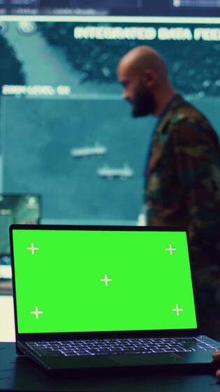 verticale le commandant examine une écran vert sur portable dans militaire commander centre, reconnaissance armée division. opérateur rassemblement intelligence de le champ, transmettre réel temps données. caméra b. Vidéo Pro
