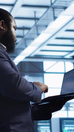verticale technicien dans Les données centre espace de travail fonctionnement système diagnostique tests et Erreur vérification utilitaires à réparer questions. employé regards pour réseau problèmes affectant plates-formes performance et connectivité, caméra une Vidéo Pro
