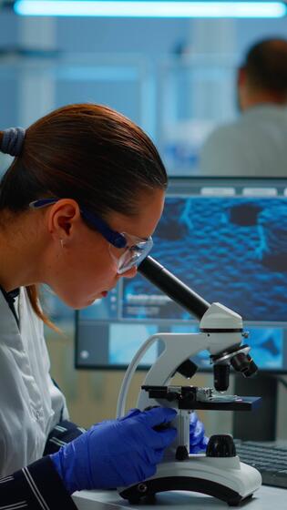 verticale . scientifique à la recherche à biologique échantillons en dessous de microscope dactylographie sur pc. équipe de chimistes travail dans laboratoire, examiner virus évolution en utilisant haute technologie pour scientifique recherche de vaccin développement. Vidéo Pro