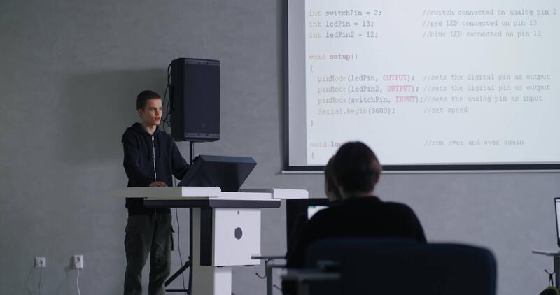 programmation et codage classe dans milieu école, diverse école garçons écoute à présentation Vidéo Pro