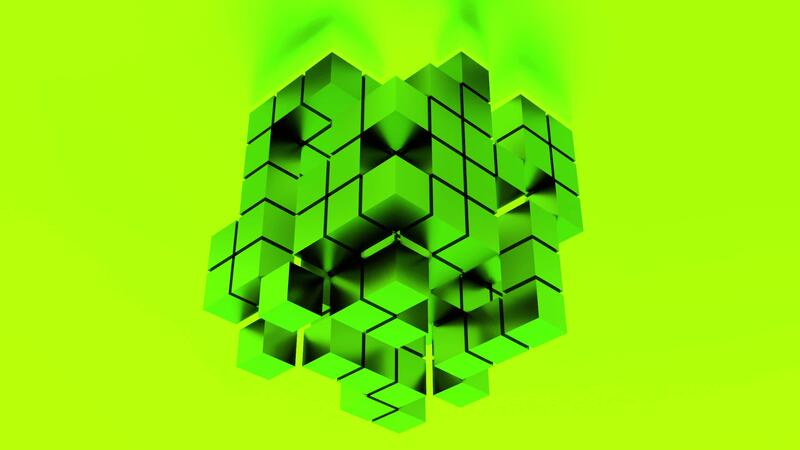 Rubik cube transformer sur une brillant Jaune et vert Contexte. conception. 3d figure de beaucoup petit cubes. Vidéo Pro