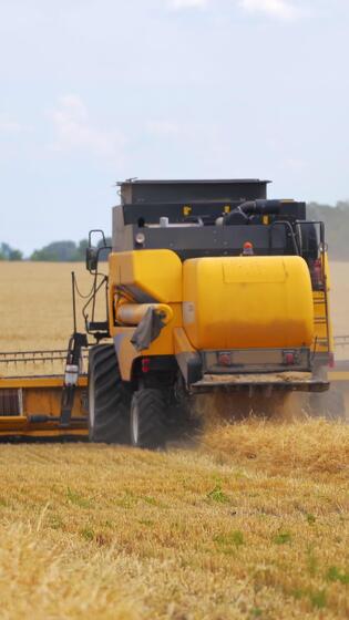 combiner récolte une mûr champ. Nouveau combiner moissonneuse travail sur une blé champ. Jaune moissonneuse machine collecte le oreilles de blé. Jaune champ avec culture. retour voir. verticale Vidéo Pro