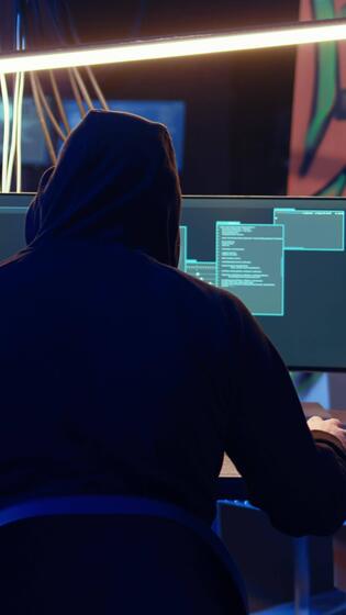 verticale encapuchonné homme dans souterrain refuge utilisant technique savoir-faire de Bugs et exploits à Pause dans ordinateur systèmes et accès de valeur données, contourner pare-feu et s'identifier processus, chariot dans coup Vidéo Pro