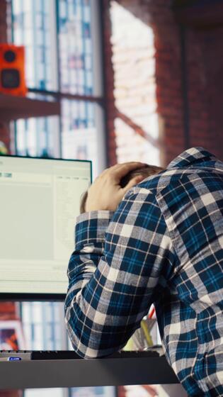 Logiciel développeur à ordinateur attendre pour code à terminer compilation, bâillement, sentiment ennuyé. impatient homme fatigué à attendez pour algorithmes bâtiment scripts à finir, caméra b Vidéo Pro