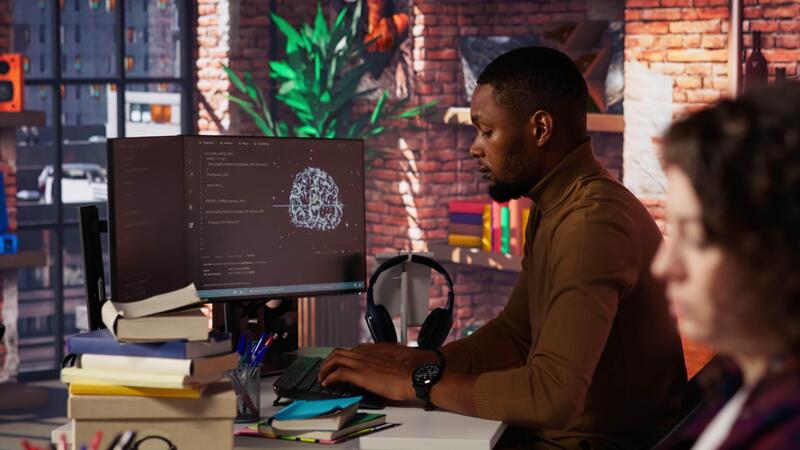 Commencez entreprise retour fin développeur fixation applications questions, transaction avec bases de données et serveur configuration. homme dans Bureau optimiser Logiciel pour amélioré performance et évolutivité, caméra b Vidéo Pro