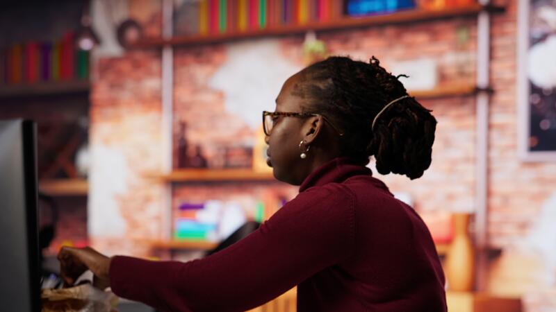 programmeur codage ai algorithme dans Commencez, en mangeant nourriture à bureau tandis que raffinage machine apprentissage des modèles. stressé femme en utilisant codage Plate-forme dans silicium vallée Bureau et profiter collation, caméra b Vidéo Pro
