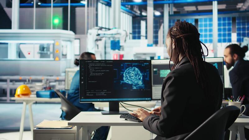 photovoltaïque usine programmeur en cours d'analyse Les données en utilisant artificiel intelligence, révision système métrique. solaire panneaux plante technicien dépannage technique problèmes en utilisant ai technologie, caméra une Vidéo Pro