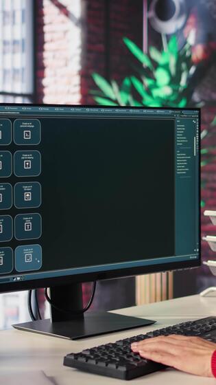 verticale femme dactylographie instructions dans un ai alimenté bavarder système sur sa ordinateur, Avancée virtuel assistant vitrines futuriste algorithmes et intelligent solutions pour productivité et connectivité. caméra b. Vidéo Pro