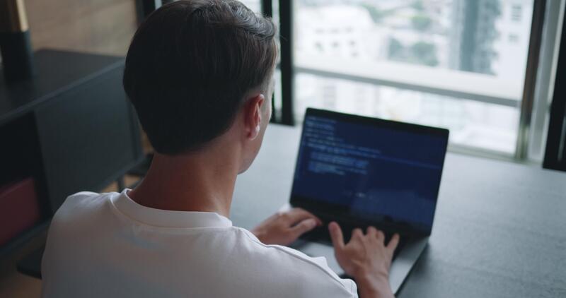arrière vue Masculin 30s codage sur portable filtrer. homme Regardez à portable filtrer, mains codage et programmation sur portable. professionnel Masculin développeur programmation applications Faire projet Tâches séance dans moderne Bureau Vidéo Pro