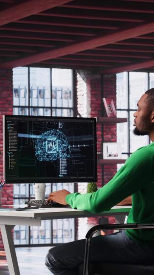 verticale africain américain technicien écrit code sur ai cerveau neural réseau pour machine apprentissage, Faire entretien et débogage le Logiciel systèmes. il expert les usages programmation langue. caméra un. Vidéo Pro