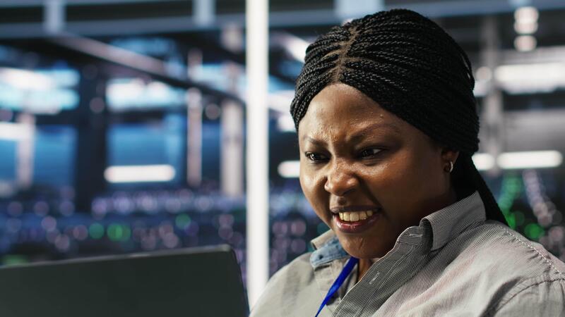 agacé Les données centre administrateur ayant difficulté Faire nœud arbre la programmation. agacé femme dans serveur pièce ayant glitch problèmes tandis que en utilisant prédictif ai visualisation systèmes sur carnet de notes, caméra b fermer Vidéo Pro