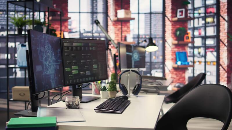 administratif espace de travail dans un vide il agence avec visuel codage et cognitif l'informatique sur pc. écran reflétant progrès dans artificiel intelligence et information systèmes. Vidéo Pro