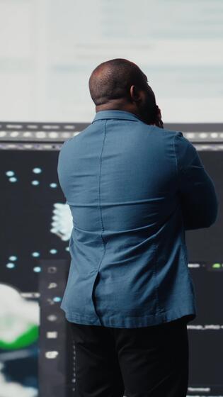 verticale noir programmeur expert engageant dans Logiciel développement à une haute technologie espace de travail, concentré sur gros Les données tableau de bord. mettant en valeur codage la vie et il algorithmes dans le technologie monde. caméra un. Vidéo Pro