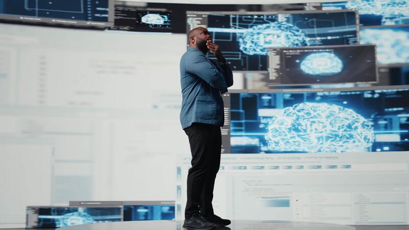 africain américain ingénieur en cours d'analyse programmation Langue pour automatisation, Les données science avec une futuriste interface derrière lui. Masculin technologie professionnel prospère avec ai et code extraits. caméra un. Vidéo Pro