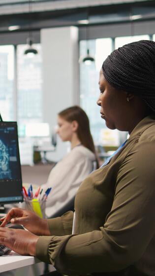 verticale gai femelle programmeur à Bureau bureau heureux après développement application en utilisant machine apprentissage automatisation. joyeux employé satisfait après débogage applications en utilisant neural les réseaux, caméra une Vidéo Pro