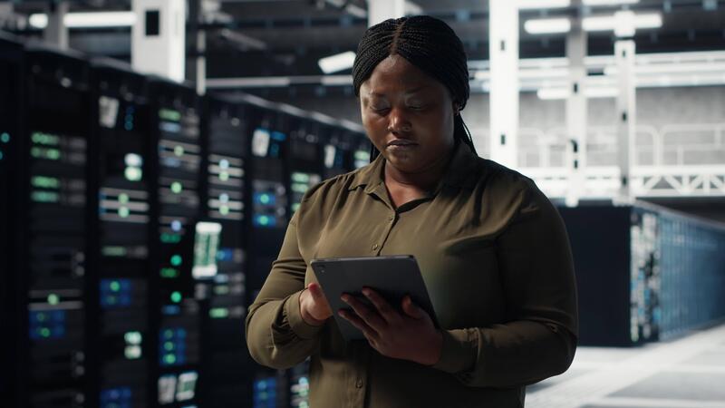 technicien en utilisant tablette dans Les données centre, en intégrant Nouveau les technologies et systèmes. employé en utilisant dispositif à superviser serveur moyeu, assurer conformité avec industrie normes, caméra b Vidéo Pro