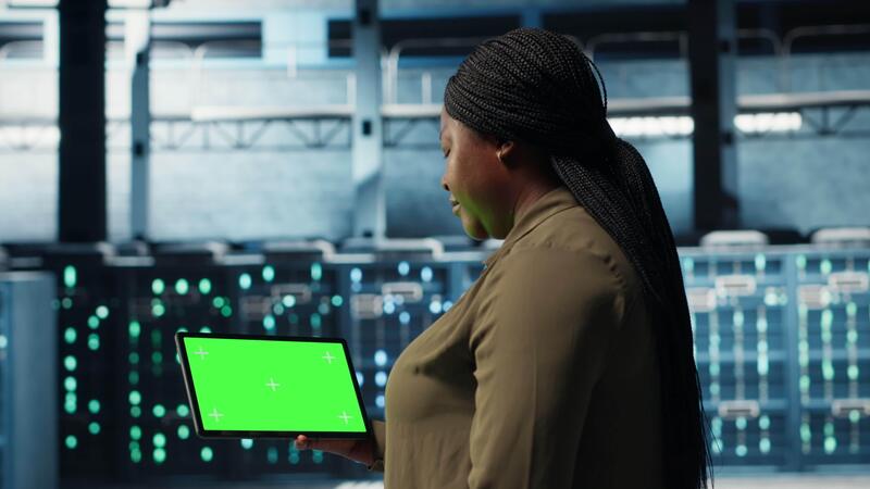 administrateur dans Les données centre en utilisant vert écran tablette à déployer Nouveau serveur architecture. serveur centre ouvrier en utilisant chrominance clé dispositif à faire sortir de la cyber-sécurité cadre, protéger données, caméra b Vidéo Pro