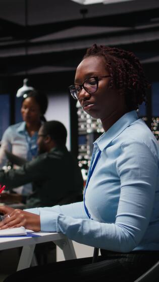 verticale Jeune femelle analyste les usages ai neural réseaux pour Les données exploitation minière et optimisation, travail dans une multinational entreprise avec automatisation outils. artificiel intelligence numérique outils pour succès. caméra un. Vidéo Pro