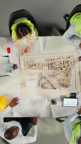 verticale Haut vers le bas vue Zoom dans de collègues dans architecture travail ensemble sur projet conception et développement. le diverse Personnel se concentre sur Urbain planification, et durable propriété investissement. caméra un. Vidéo Pro