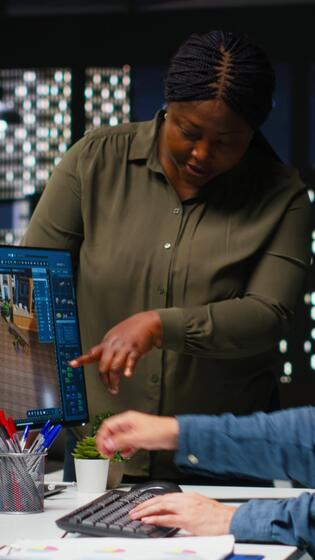 verticale graphique conception équipe utilisation architectural Logiciel et plans pour 3d rendre de Accueil intérieur. programme permet à configurer meubles et autre conception éléments pour une virtuel mise en page. caméra b. Vidéo Pro