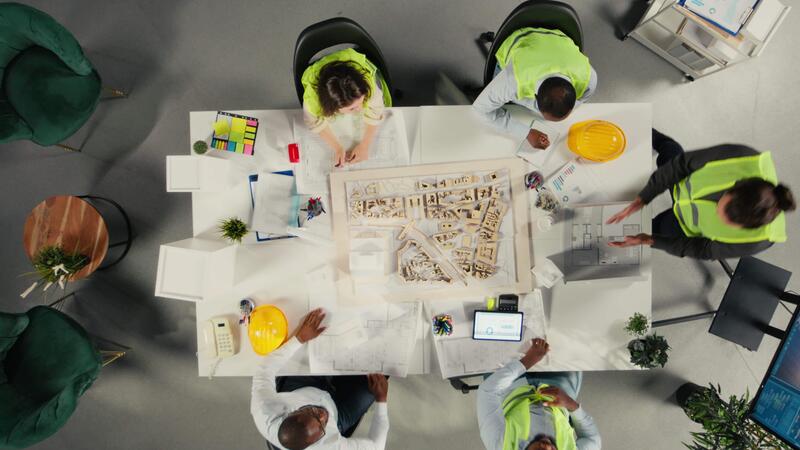 Haut vers le bas vue Zoom dans de collègues dans architecture travail ensemble sur projet conception et développement. le diverse Personnel se concentre sur Urbain planification, et durable propriété investissement. caméra un. Vidéo Pro