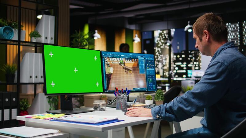chrominance clé et cad programme utilisé par africain américain architectural spécialiste à conception une moderne appartement, 3d rendre interface sur double moniteurs. architectural 3d logiciel. caméra un. Vidéo Pro