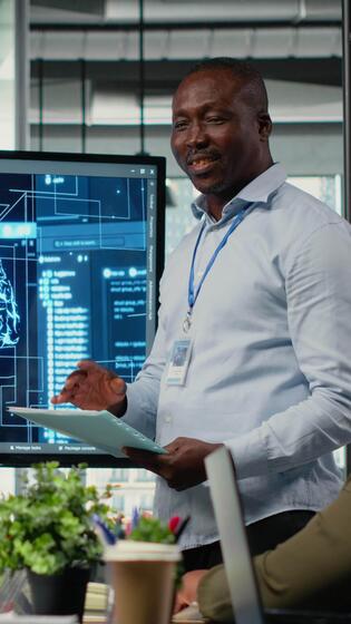 verticale programmeur donne présentation à cadres, exécution ai chatbot réduire travail volume. Commencez Bureau il expert en cours d'analyse affaires connaissances pour la gestion en utilisant artificiel intelligence, caméra b Vidéo Pro