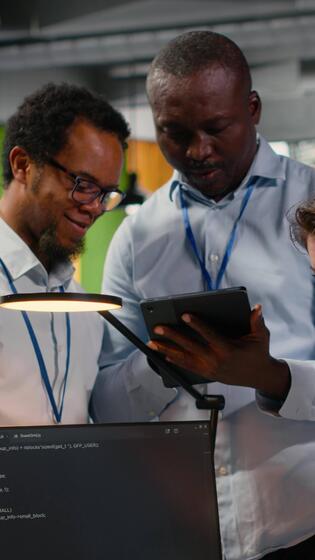 verticale Multi-éthnique techniciens utilisation dispositifs dans ai Commencez Bureau à train prédictif des modèles pour Langue En traitement Tâches. multiracial collègues de travail utilisation Profond apprentissage technique compétence pour Tâches, caméra b Vidéo Pro